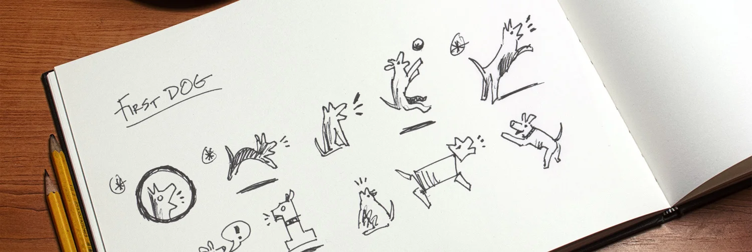 I began with several rough ideas, all focused on a dog image as a central mark, according to the client’s wishes. After several iterations, we settled on a stylized silhouette of a barking canine that resembled a rottweiler, raised up on his hind legs to roughly resemble the number 1, and with his front paw extended to form a subtle 'F' shape.